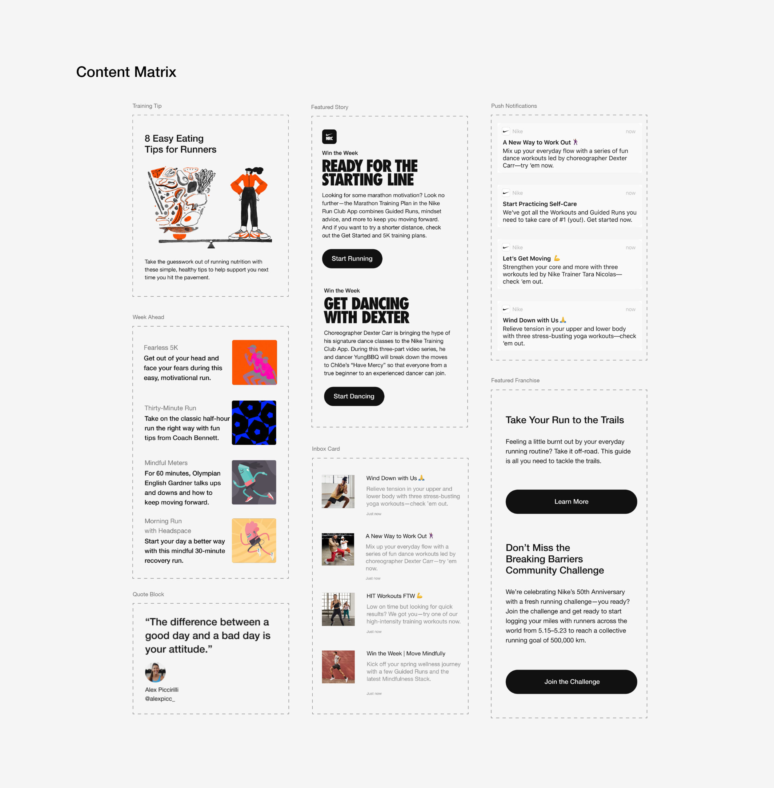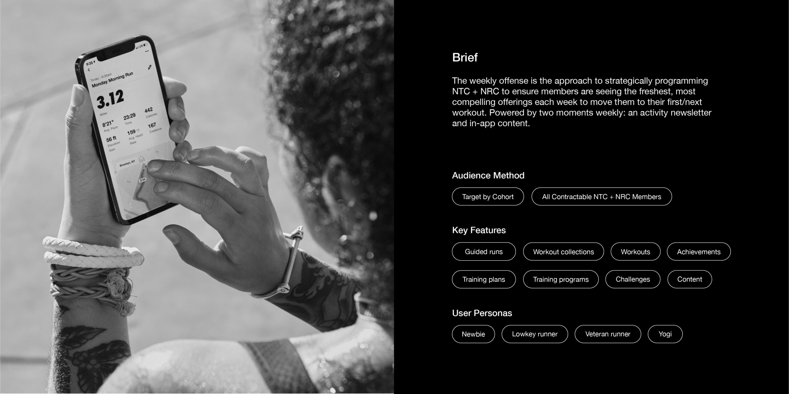Nike Run Club (NRC) and Nike Training Club (NTC) make getting fit fun, social, and totally doable — from hitting the pavement to perfecting your downward dog. Both combine guided programs, tracking tools, and vibrant communities to keep users motivated and progressing toward their goals. The core idea: “double down”. Brand the two apps with equal balance and push it forward. This wasn’t just a email newsletter: it was strategic and creative foundation permeating every aspect of the brand, from storytelling to design and experience.